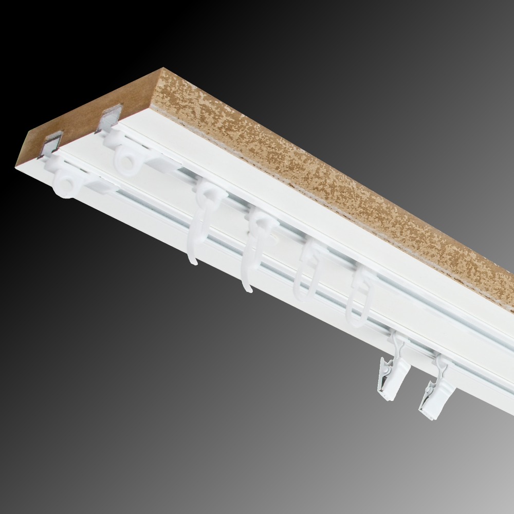 Záclonová dvoukolejnice vyrobená z kvalitní MDF desky se zafrézovanou kovovou (alu) drážkou. Kolejnice je určena především pro montáž na strop, lze ji montovat samostatně s možností nažehlení přední hrany nebo suchého zipu nebo například do garnýže. Kolejnice se vyrábí s bílou povrchovou úpravou o maximální délce 559 cm.
