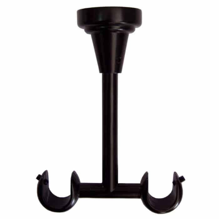Kovový držák duo stropní pro garnýže průměr 16mm v barvě černá, černo/zlatá, satyna nikl, stříbrná mat, zlatá antik, bílo/zlatá a chrom tepaný. Vzdálenost garnýže od stropu do středu tyče je 12,5 cm, vzdálenost mezi tyčemi 6,5 cm do středu tyčí. Pro délku nad 200 cm doporučujeme uchytit tyč také držákem umístěným na střed, zabráníte tím možnému prohnutí tyče. Délku držáku (vzdálenost garnýže od stropu) lze upravit zkrácením tyčky držáku, lze snado pomocí pilky na železo.